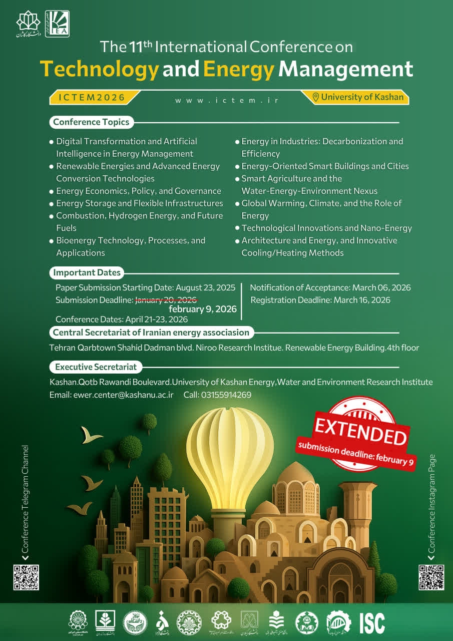 On behalf of the Organizing Committee, it is our distinct privilege to extend a cordial invitation to the 11th International Conference on Energy Technology and Management, to be convened at the University of Kashan. This prestigious gathering is dedicated to addressing the Energy management and the Energy sustainability,  Digital Transformation and Artificial Intelligence in Energy Management, Renewable Energies and Advanced Energy Conversion Technologies, Energy Economics, Policy, and Governance, Energy Storage and Flexible Infrastructures, Combustion, Hydrogen Energy, and Future Fuels, Bioenergy Technology, Processes, and Applications, Energy in Industries: Decarbonization and Efficiency, Energy-Oriented Smart Buildings and Cities, Smart Agriculture and the Water-Energy-Environment Nexus, Global Warming, Climate, and the Role of Energy, Technological Innovations and Nano-Energy, Architecture and Energy, and Innovative Cooling/Heating Methods, which are paramount to our nation's technological advancement and economic resilience. The conference is designed to serve as a critical nexus for academia, industry, and policy-makers to disseminate pioneering research, debate innovative strategies, and forge collaborative pathways. Thematic priorities will encompass a rigorous examination of renewable energy integration, advanced energy storage systems, smart grid technologies, and sustainable energy policy frameworks, with the ultimate objective of translating scientific discovery into pragmatic, localized solutions.